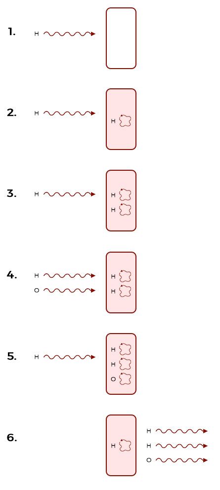 Two Hydrogen threads are admitted in the machine as they arrive but when the third thread arrives in step 3, it is made to wait. When an Oxygen thread arrives in step 4, it is allowed to enter the machine. A water molecule is formed in step 5 which exists the machine in step 6. That is when the waiting Hydrogen thread is notified and the process of creating more molecules continues. The threads can arrive in any order which means that HHO, OHH and HOH are all valid outputs.