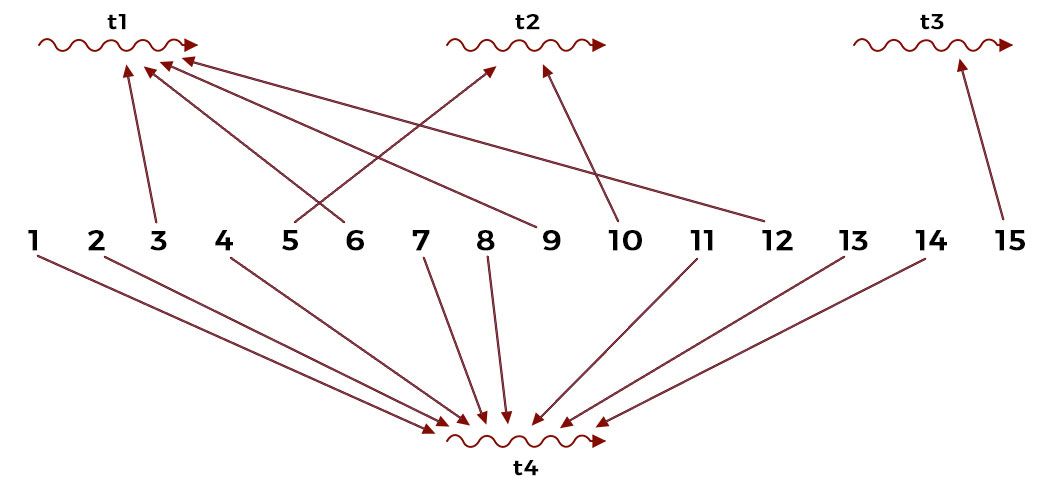 Suppose we have four threads t1, t2, t3 and t4. Thread t1 checks if the number is divisible by 3 and prints fizz. Thread t2 checks if the number is divisible by 5 and prints buzz. Thread t3 checks if the number is divisible by both 3 and 5 and prints fizzbuzz. Thread t4 prints numbers that are not divisible by 3 or 5. The workflow of the program is shown below: